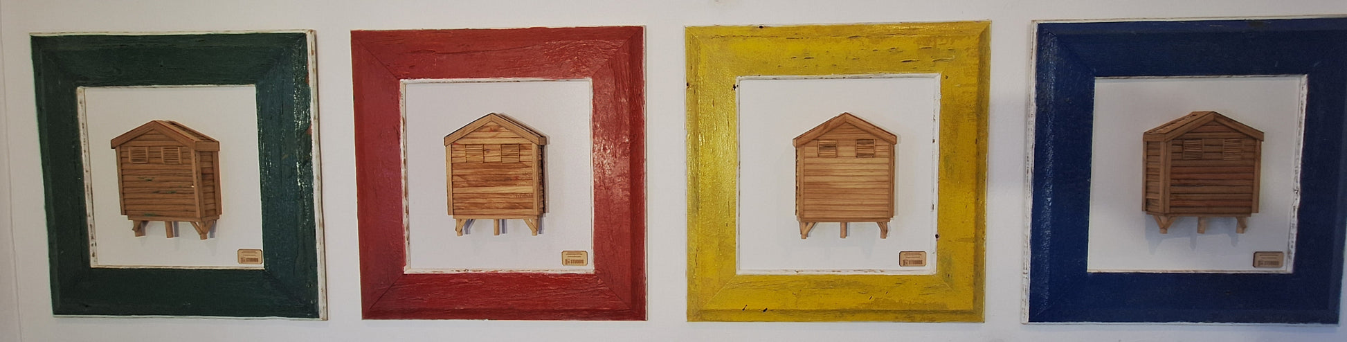 Sculpted from the original Beach Hut wood and framed in the same, these unique sculptural representations of the Muizenberg Beach Huts have been meticulously crafted by the very hands of the local artist who has helped keep these beach huts maintained.